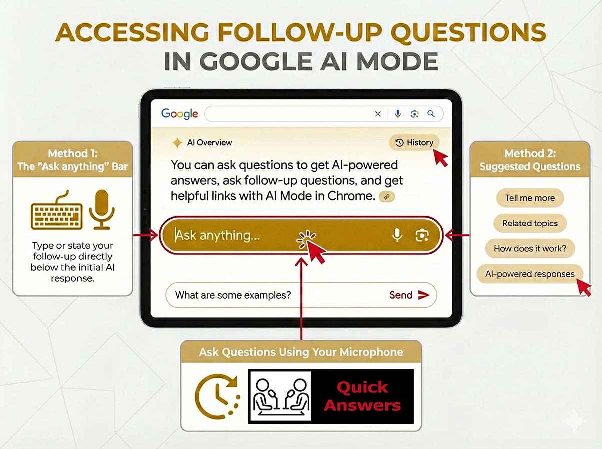 “Just ask anything” represents a shift in Google Search, powered by Gemini, to a conversational, AI-driven experience (AI Mode) that handles complex, multi-turn queries. In contrast, AI follow-up questions are specific conversational prompts used within that model to refine, deepen, or narrow down search results. This allows for sustained context in a single session.